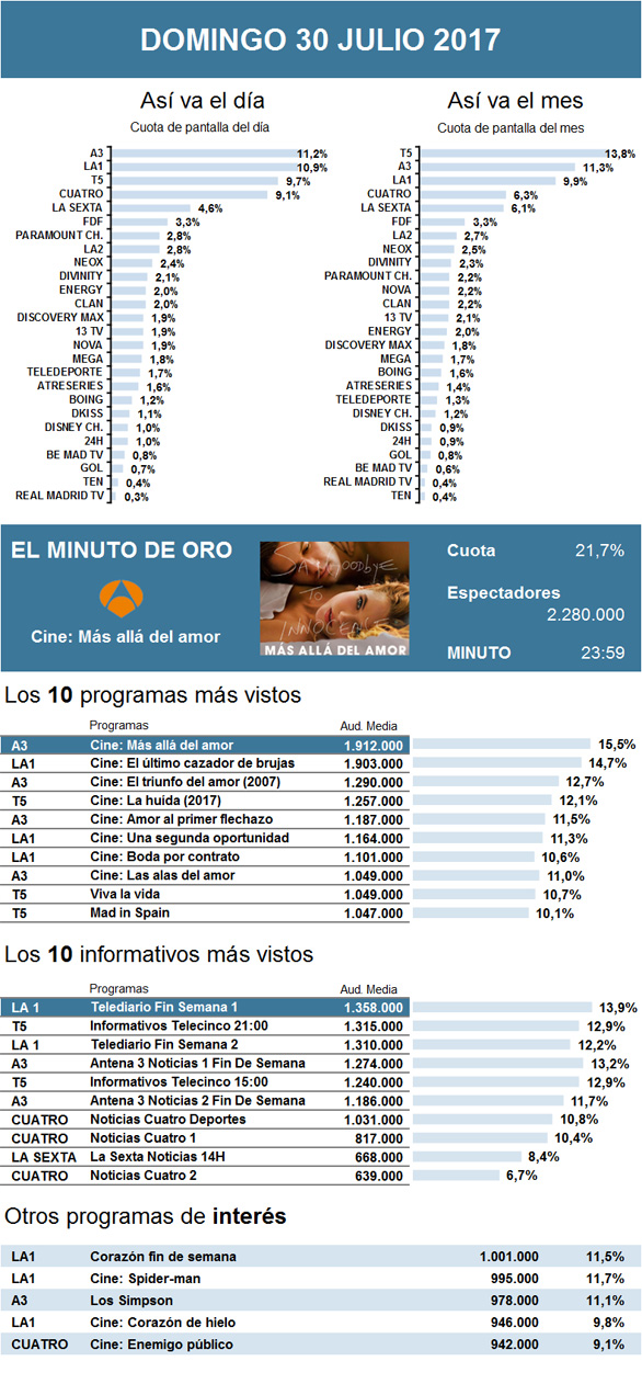 Sin fútbol en la noche de este domingo, Antena 3 lideró por completo el día gracias al estreno de Más allá del amor. La cinta se coronó minuto de oro y fue lo más visto de la jornada con una considerable mejoría en relación con sus cifras de la semana pasada al lograr medio millón más de curiosos. Con un ascenso menos potente, le siguió muy de cerca la película de La 1 que, con El último cazador de brujas, repitió como segunda opción de la noche.