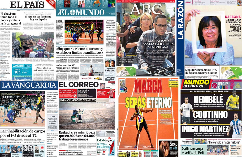 "La amarga despedida de Usain Bolt", abre El Mundo, que entrevista a la presidenta del PSOE: "Hay que reordenar el turismo y establecer límites cuantitativos", dice Cristina Narbona. En el faldón: "Así actúan los 500 'borrokas' del 'procés'". En la columna de salida: "Puigdemont tiene 24 horas para convocar también el 1-O las elecciones"; "Maduro fulmina a la fiscal rebelde y Mercosur expulsa a Venezuela" y "Cuatro voluntarios españoles fallecen en un accidente de autobús en India".