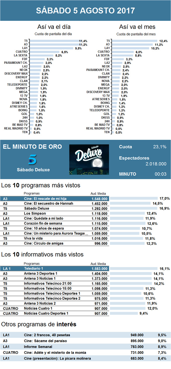 Sin fútbol este sábado, Telecinco retomó el minuto de oro con Sábado Deluxe. Sin embargo, el cine de sobremesa de Antena 3 volvió a ser lo más visto de la jornada. Aun así, Jorge Javier Vázquez y su programa nocturno se alzaron nuevamente como espacio destacado del 'prime time' con una mejora en comparación con sus datos de la semana pasada gracias a la entrevista realizada a Alba Carrillo, segunda finalista de Supervivientes.