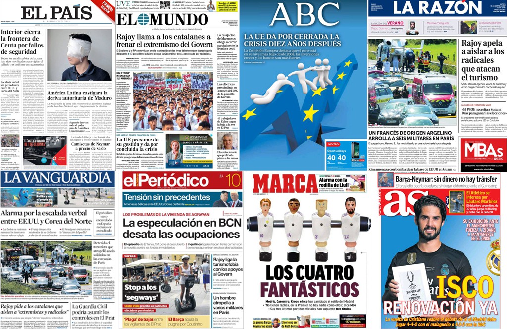 El Mundo con foto de cientos de jóvenes norcoreanos gritando y agitando consignas contra Estados Unidos dice: “Kim y Trump intensifican sus amenazas”. Titular destacado para el desafío independentista: “Rajoy llama a los catalanes a frenar el extremismo del Govern”. En el ámbito económico: “La UE presume de su gestión y da por concluida la crisis” y asegura que la Eurozona está “en forma”. Además: “La relajación de Marruecos obliga a cerrar parcialmente la frontera ceutí” y “40 trabajadores de Eulen cogen la baja a la vez en El Prat”.