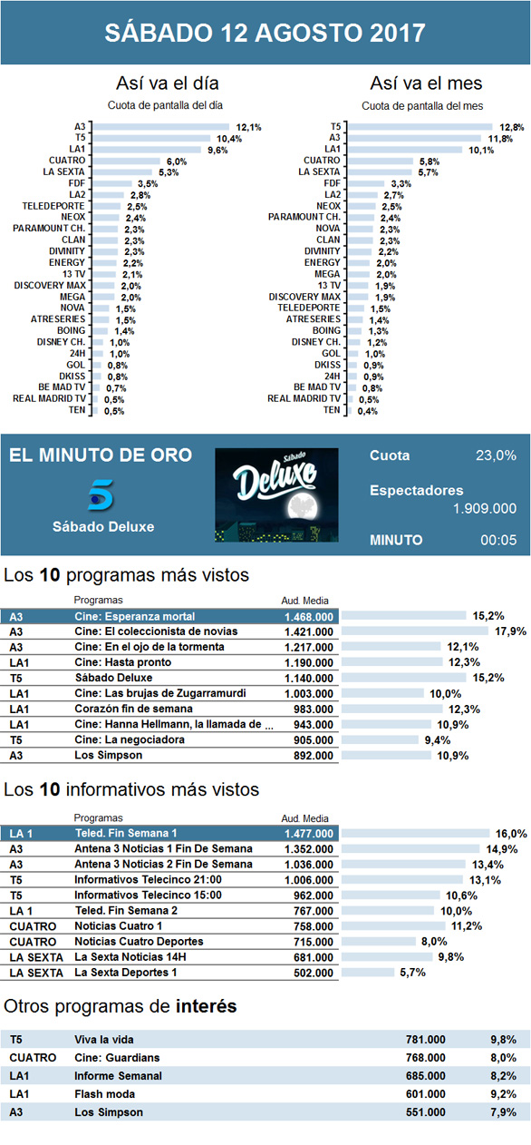 La primera edición del Telediario de La 1 fue lo más visto durante el sábado. En cuanto a los programas de entretenimiento, Antena 3 logró colar tres películas en el podio -los telefilms de tarde superaron a 'El peliculón'. Todas ellas superaron la media de espectadores registrada por Sálvame Deluxe en Telecinco.