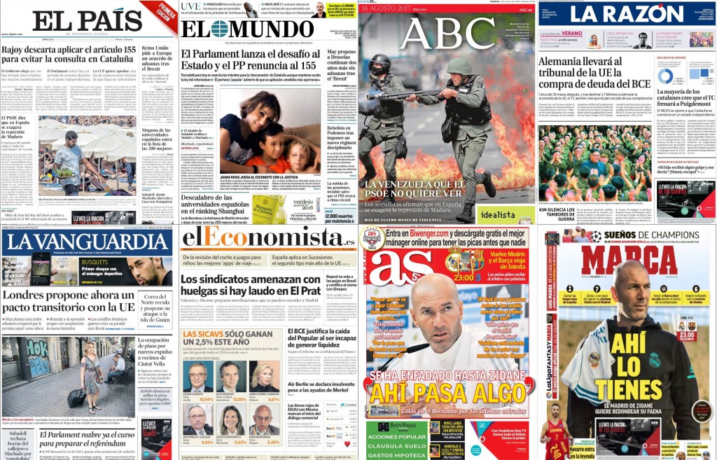 En El País: “Rajoy descarta aplicar el artículo 155 para evitar la consulta en Cataluña”. En la fotografía, un hombre sirve mojitos en la playa de la Barceloneta: “Mojitos en la playa, una amenaza para la salud”. Dice el diario que analizados bocadillos, empanadillas y mojitos de vendedores ambulantes, se han encontrado bacterias fecales en proporciones superiores a las permitidas. Más cosas: “El PSOE dice que en España se exagera la represión de Maduro” y “Reino Unido pide a Europa un acuerdo de aduanas tras el Brexit”.