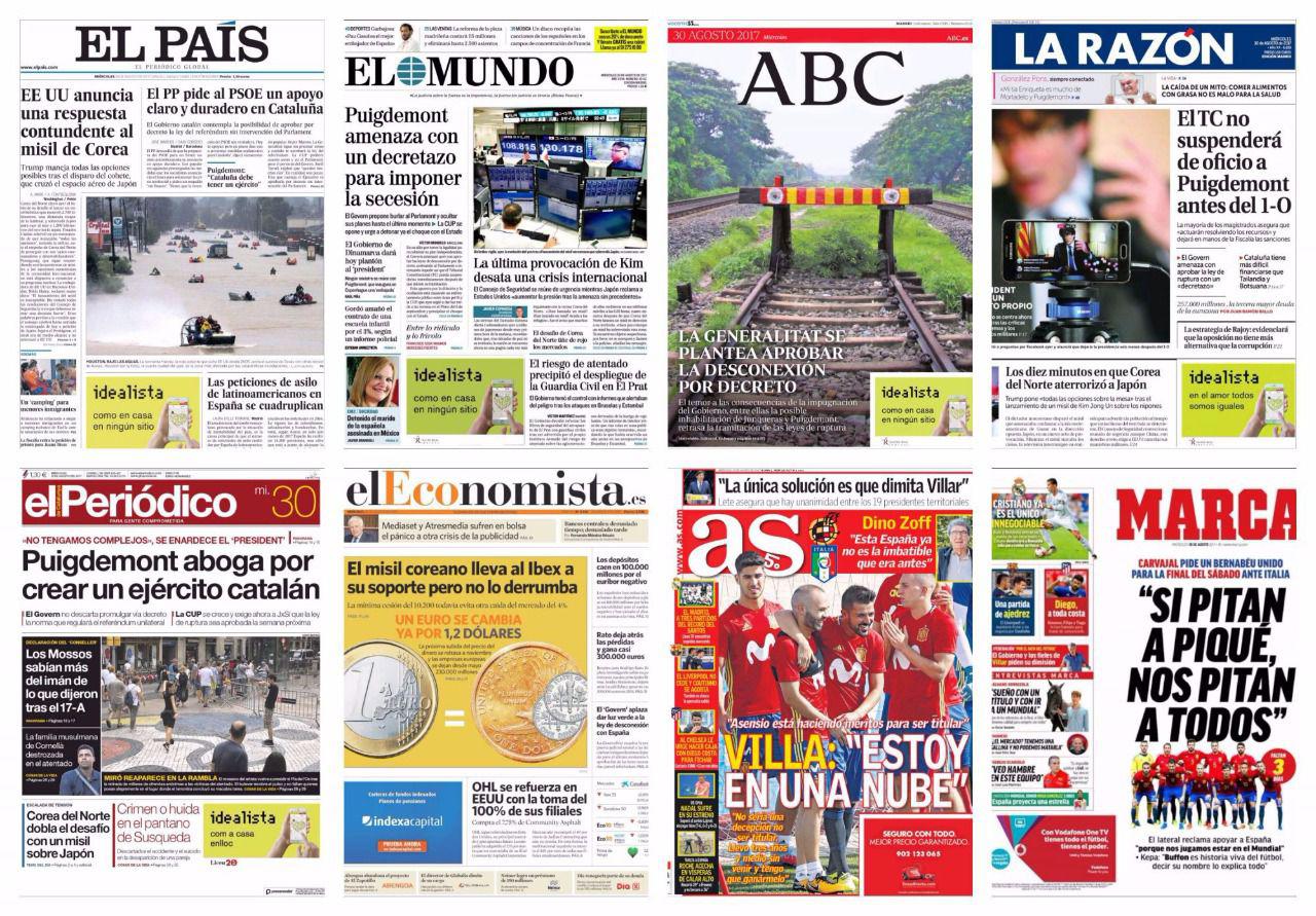 El Mundo con foto de las investigaciones sobre Corea del Norte que se llevan desde Japón, dice: “La última provocación de Kim desata una crisis internacional”. Titular destacado para Cataluña: “Puigdemont amenaza con un decretazo para imponer la secesión”. “El Govern propone burlar al Parlament y ocultar sus planes hasta el último momento”. En el mismo sentido anuncia: “El Gobierno de Dinamarca dará hoy plantón al ‘president’”. Y las últimas informaciones sobre Pilar Garrido: “Detenido el marido de la española asesinada en México”.