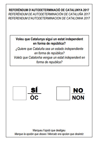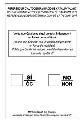 Entre otras cuestiones, publica la documentación electoral y el modelo de papeleta en el que plantea la pregunta '¿Quiere que Cataluña sea un estado independiente en forma de república?, indica que el censo electoral es el que se haya cerrado el 30 de marzo de 2017, anuncia que el Gobierno catalán realizará una campaña de carácter institucional y otra de propaganda que tendrá una duración de 15 días, concretamente del 15 de septiembre al 29 de septiembre.