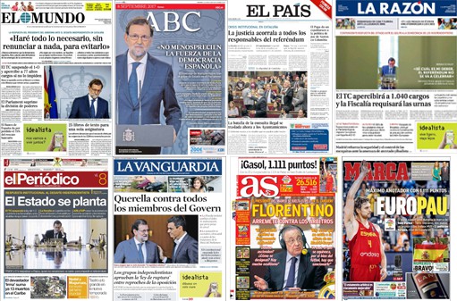 El País destaca que la justicia "acorrala a todos los responsables del referéndum" en referencia a las decisiones adoptadas por la Fiscalía y el Constitucional. "Contra lo que suponen algunos secesionistas, el Estado español, el Estado de derecho, es fuerte. Pero más porque se asienta en el consenso y la confianza ciudadana que porque disponga, como dispone, de mecanismos de actuación contundentes", dice en su editorial.