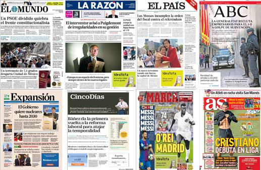 Según El Mundo, un PSOE dividido "quiebra el frente constitucionalista". Los socialistas "fuerzan que el Congreso rechace apoyar al Gobierno ante el 1-O tras ser incapaces de pactar un texto con Cs". La foto de portada también es para México.