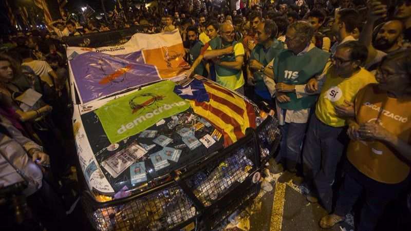 Pasadas las tres de la madrugada, los agentes de la Guardia Civil que permencían en la consejería de Economía de la Generalidad han conseguido abandonar el edificio gracias a un pasillo de seguridad creado por los Mossos, quienes habían sido señalados durante horas por su pasividad ante el acoso a los guardias civiles de cientos de manifestantes.