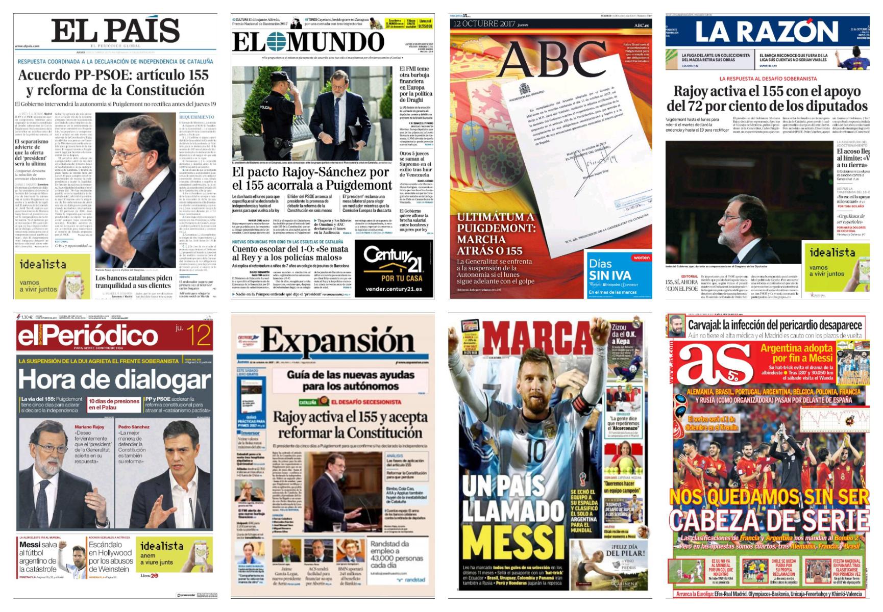 La respuesta "coordinada" a la declaración de independencia de Cataluña copa la primera página de El País con foto del presidente del Ejecutivo, que destaca: "Acuerdo PP-PSOE: artículo 155 y reforma de la Constitución" y recuerda: "El Gobierno intervendrá la autonomía si Puigdemont no rectifica antes del jueves 19". Además: "El separatismo advierte de que la oferta del 'president' será la última" y "Los bancos catalanes piden tranquilidad a sus clientes".