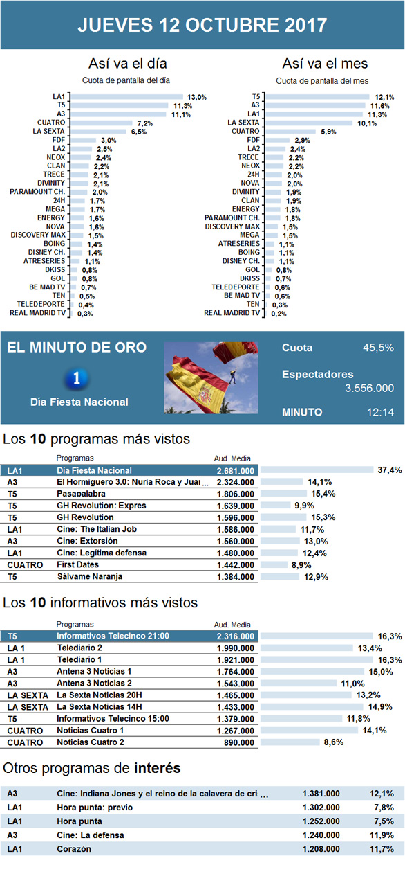 Bajo el lema "Orgullosos de ser españoles", el desfile de la Fiesta Nacional no sólo reunió a una gran multitud en las calles de Madrid, sino también ante el televisor. Su retransmisión en La 1 fue lo más visto del día y logró coronarse como minuto de oro, incluso llegó a mejorar los datos del año pasado. Cabe destacar que, junto con su retransmisión en el canal 24H, el desfile rondó los 3 millones de seguidores y una cuota de pantalla del 40,8 por ciento.