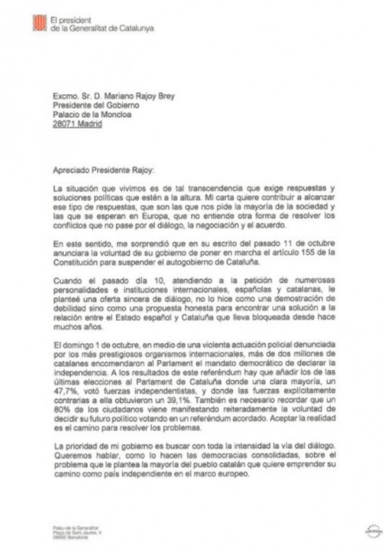 En la misiva, Puigdemont afirma que la situación que vivimos es "tan trascendental" que exige "respuestas y soluciones políticas que estén a la altura" al tiempo que apela a Europa, "que no entiende otra forma de resolver los conflictos que no pase por el
