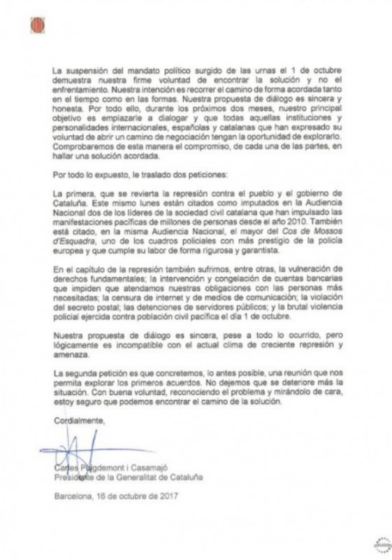 Carles Puigdemont ha pedido este lunes por carta al presidente del Gobierno, Mariano Rajoy, dos meses para dialogar y le ha propuesto fijar "lo antes posible" una reunión para explorar acuerdos.
