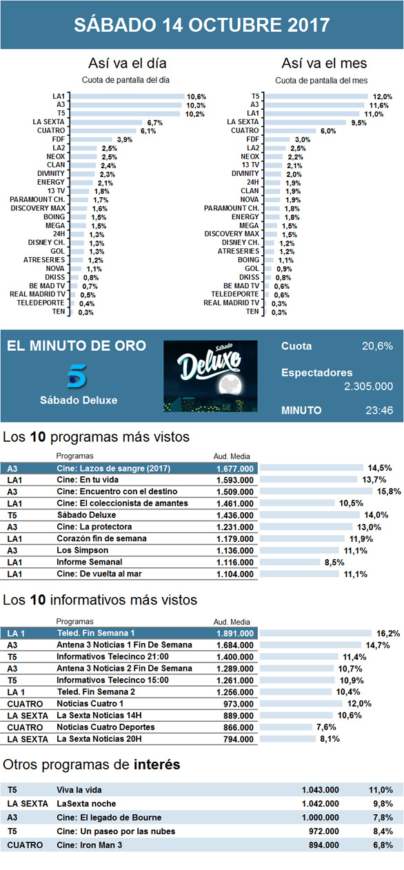 Una vez más, Telecinco se coronó como minuto de oro con Sábado Deluxe. Sin embargo, el cine de sobremesa de Antena 3 no cedió su puesto como lo más visto de la jornada con la cinta Lazos de sangre (2017). Durante el horario estelar tampoco hubo muchos cambios: reñida disputa por el primer puesto nocturno entre una película y el programa presentado por Jorge Javier Vázquez. En esta ocasión, con casi medio millón más de interesados que la semana anterior, fue el cine de La 1 el que logró atraer más seguidores que Sábado Deluxe gracias a El coleccionista de amantes. Sin embargo, el programa volvió a superar a sus rivales en cuota de pantalla.