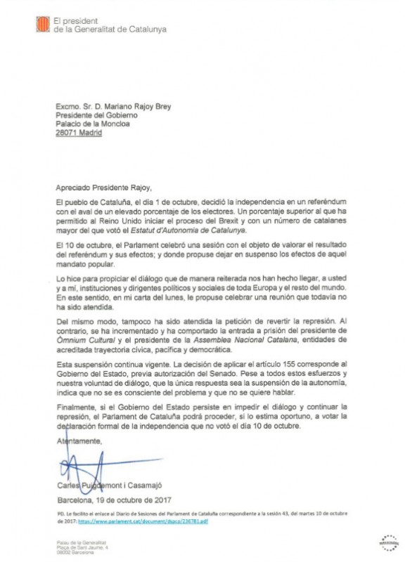 - Carles Puigdemont ha contestado al requerimiento del Gobierno afirmando que si el Ejecutivo "persiste en no dialogar y continúa la represión", el Parlament "procederá a votar la declaración de independencia que no votó el 10 de octubre".