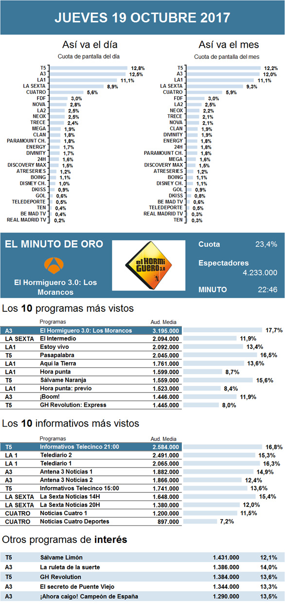 Una semana después de la programación especial por el día de Fiesta Nacional, El Hormiguero 3.0 lideró el jueves. Además de conseguir que Antena 3 mantuviese el minuto de oro por cuarto día consecutivo, el programa también logró ser lo más visto de la jornada. Durante el horario estelar destacó Estoy vivo, de La 1 que, tras su descanso de la semana pasada, regresó con su sexto capítulo y sus peores registros de la temporada, cercanos a los 2,1 millones de interesados y a un 13,4 por ciento de cuota.