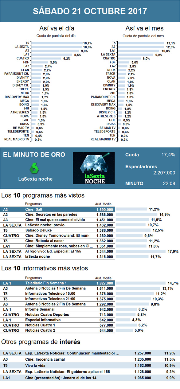 Durante el día, destacó la cobertura realizada por La Sexta después de que Mariano Rajoy activase el Artículo 155 en Cataluña. Mientras que su programa Al rojo vivo: Edición Especial: El 155 reunió más de 1,3 millones de interesados, sus noticiarios especiales no se alejaron demasiado de dicha cifra con el seguimiento de la trascendental jornada política.