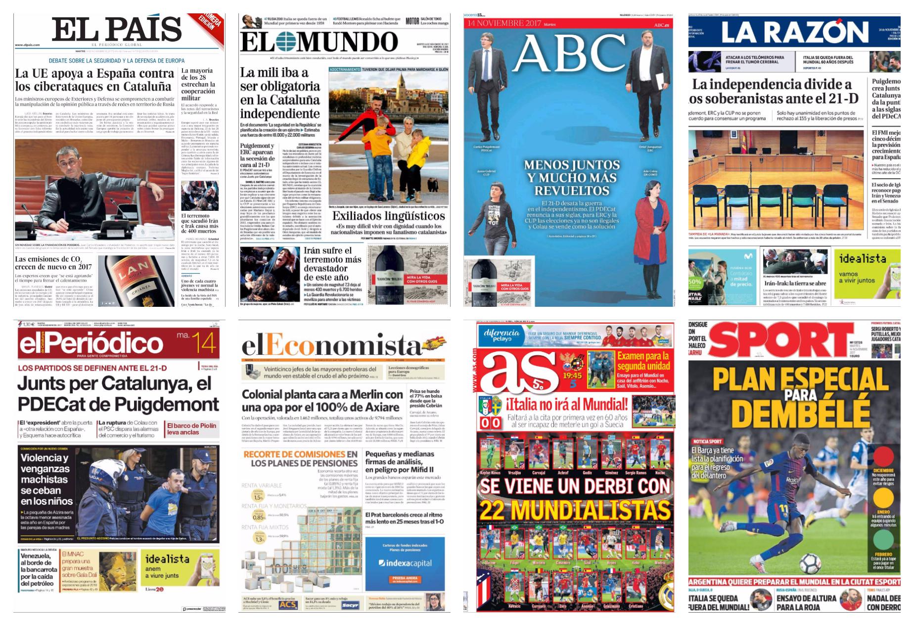 La Razón ilustra su portada con una imagen del juicio de “La Manada”, en ella se puede observar que la butaca de los cinco acusados permanece vacía después de que en la primera vista negaran todos los hechos excepto haber robado el móvil a la joven. Destaca a dos columnas la cuestión catalana: “La independencia divide a los soberanistas ante el 21-D”. Recoge además que “Puigdemont crea Junts per Catalunya y da la puntilla a las siglas del PDeCAT”; el FMI mejora la previsión de crecimiento para España; los pagos de Irán y Venezuela que recibió Podemos en los primeros tiempos de su fundación y el terremoto en Irán e Irak: “La tierra se abre”.