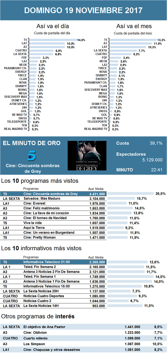 La que fuera un éxito en taquilla, Cincuentas sombras de Grey, repitió hazaña en su estreno televisivo y reafirmó el liderazgo de Telecinco. La película no sólo se coronó minuto de oro y fue lo más seguido del domingo sino que, gracias a más de 4,4 millones de espectadores y a una cuota de pantalla del 26,5 por ciento, se convirtió en la película más vista del curso. Estas cifras también le supusieron a la cadena un fuerte crecimiento en comparación con la cinta que, hace una semana, logró mantener a Telecinco como líder.