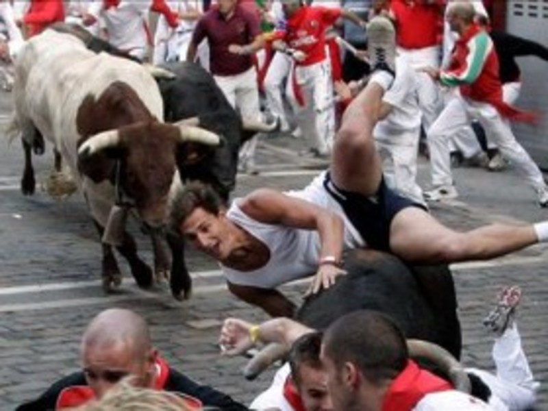 La manada no ha resbalado al llegar a la curva de Mercaderes, aunque, al principio de la calle Estafeta, se ha producido uno de los momentos más peligrosos del encierro cuando en la parte izquierda de la calle se ha creado un pequeño montón formado por cinco corredores y dos de los astados han pasado por encima de ellos. En ese mismo punto, al comienzo de la calle Estafeta, uno de los corredores, un joven californiano, ha recibido un puntazo en el abdomen.