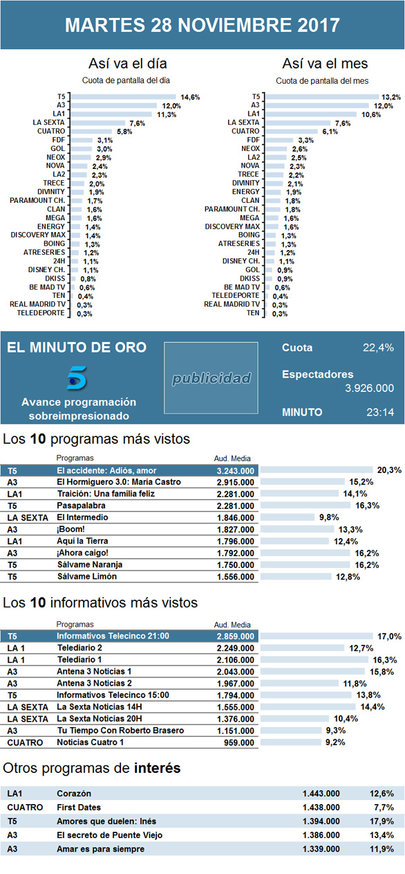 Este martes destacó por su noche de estrenos. Telecinco se impuso a sus rivales con el primer capítulo de El accidente, con Inma Cuesta y Quim Gutiérrez como protagonistas, gracias a un 20,3 por ciento de cuota y más de 3,2 millones de curiosos. Esto le supuso a la cadena una subida de 2 millones de espectadores en comparación con los reunidos hace una semana por su apuesta cinematográfica. Además, impulsó los datos del posterior programa, el también estreno de Amores que duelen, que alcanzó los 1,4 millones de interesados en su primera entrega.