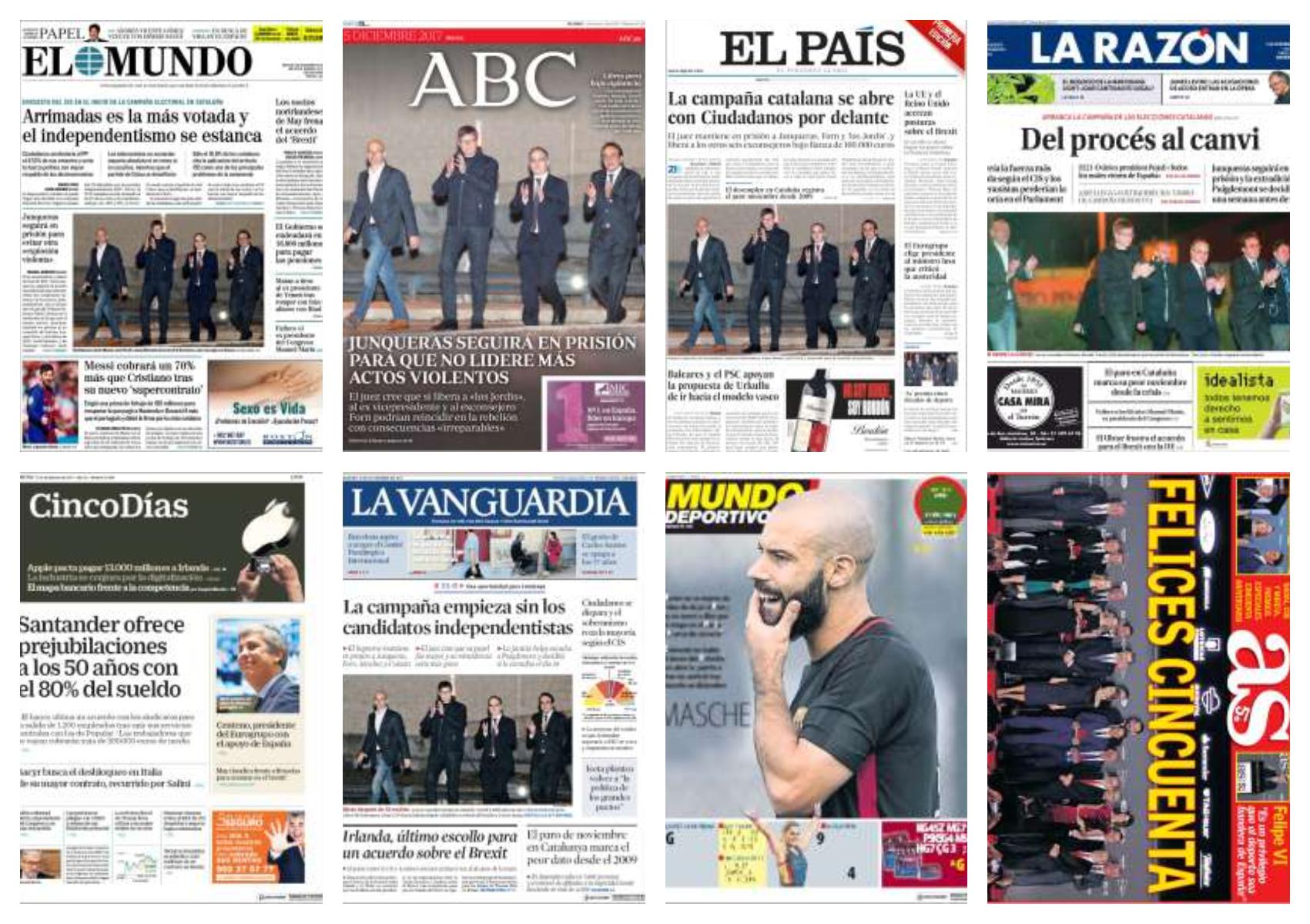El País analiza este martes los datos del sondeo del CIS correspondientes a la intención de voto de cara a las elecciones del 21D en Cataluña. "La campaña catalana se abre con Ciudadanos por delante", dice el periódico de Prisa, que destaca, asimismo, que el juez del Tribunal Supremo mantiene en prisión a Junqueras, Forn y 'los Jordis'. La foto de portada es para los cuatro exconsejeros que quedaron este lunes en libertad. Otros temas destacados de primera página son que la UE y Reino Unido acercan posturas sobre el brexit y que Baleares y el PSC apoyan la propuesta de Urkullu de ir hace el modelo vasco.