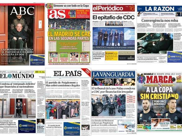 "Condena al 'entramado delictivo' que financiaba al nacionalismo", titula El Mundo, que dedica también su foto de portada a Millet. "El expolio del Palau certifica el 'entramado delictivo' que alentó el pujolismo para cimentar su hegemonía política a lo largo de tres décadas". Ni el "mar de esteladas" ni las "trapacerías antidemocráticas del separatismo catalán pueden tapar ya el fétido olor de sus vergüenzas".