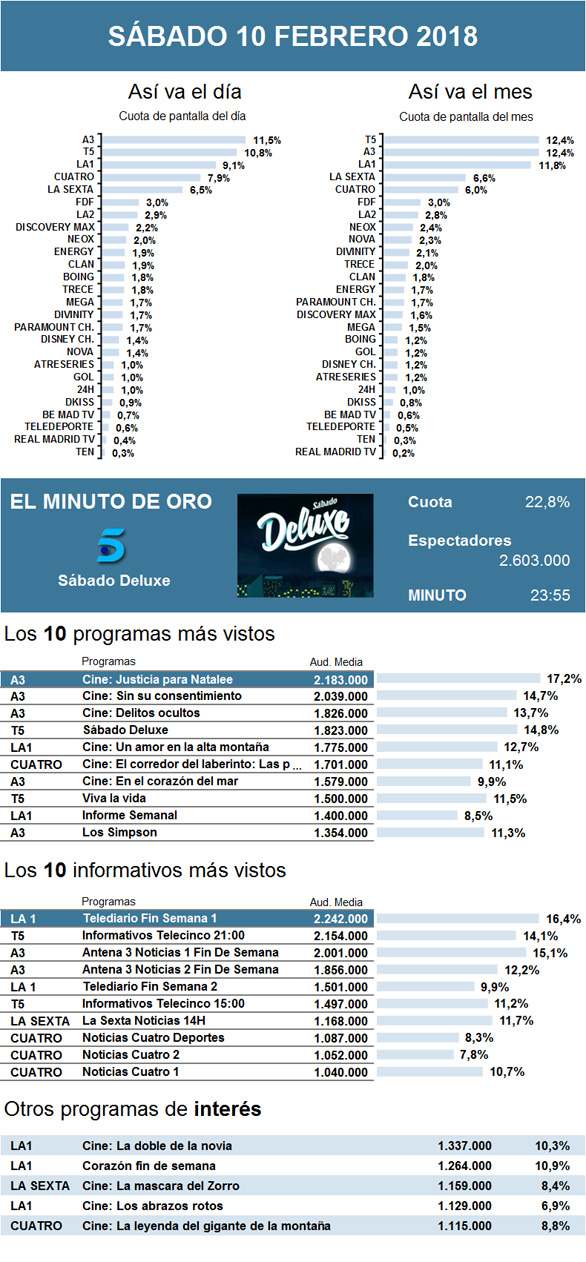 Tras la implacable victoria de Los Goya hace una semana, en esta ocasión retomó el minuto de oro Sábado Deluxe. Sin embargo, el programa nocturno de Telecinco no logró hacerse con el puesto de espacio de entretenimiento más visto del día, posición que obtuvo el cine de sobremesa de Antena 3 con la película Justicia para Natalee.