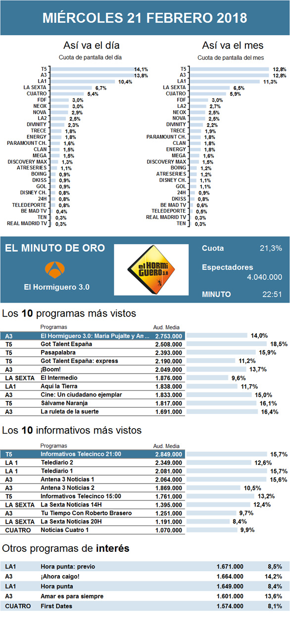 Por segundo miércoles consecutivo, El Hormiguero 3.0 se hizo con el liderazgo. El programa de Antena 3 repitió como minuto de oro y logró ser, una vez más, el espacio de entretenimiento más visto del día con una leve mejora en comparación con sus datos de la semana pasada.