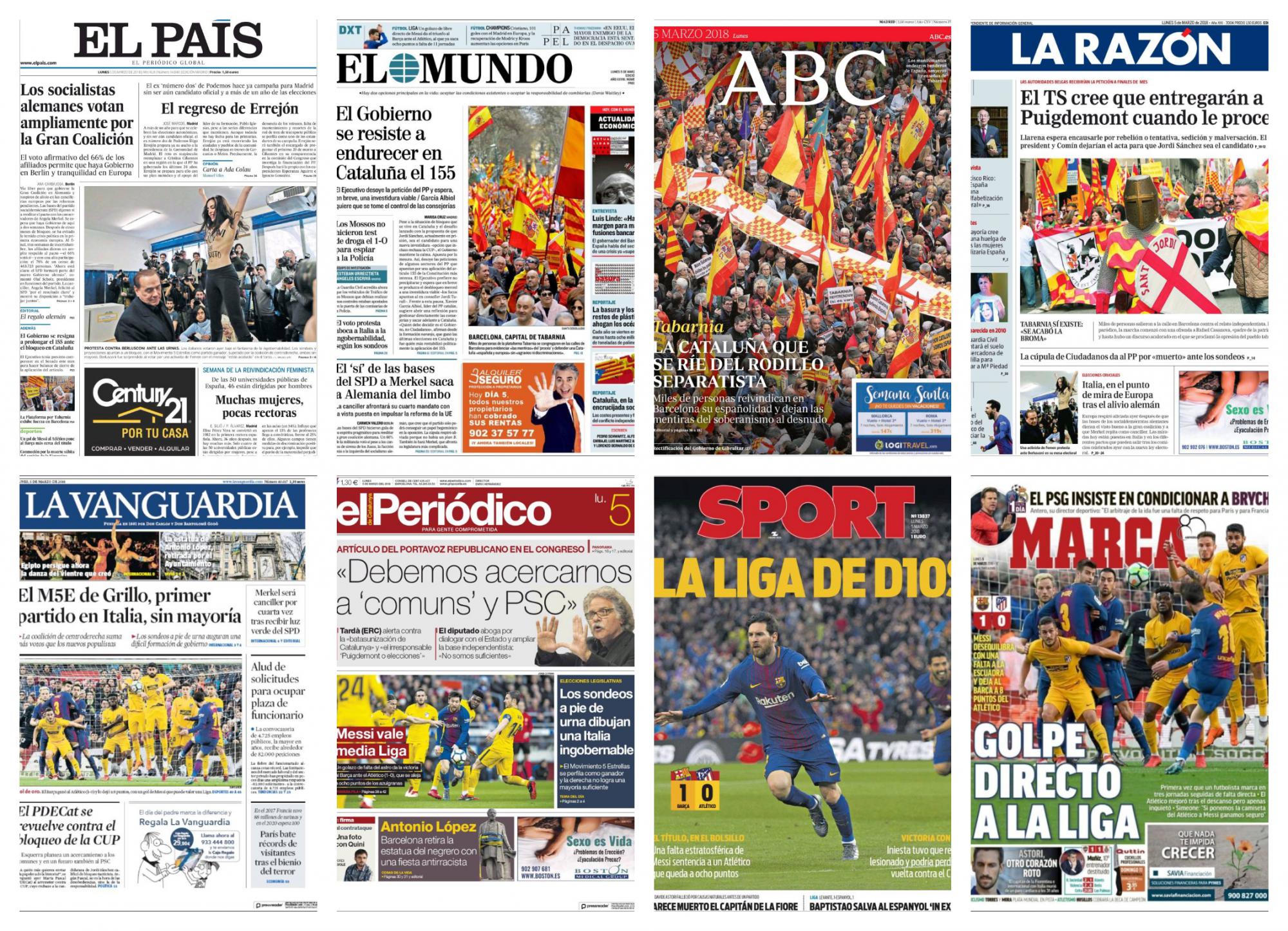 El Mundo con foto de la manifestación en Barcelona convocada por Tabarnia, titula: “El Gobierno se resiste a endurecer en Cataluña el 155”. El diario también destaca: “El voto protesta aboca a Italia a la ingobernabilidad, según los sondeos” y “El ‘sí’ de las bases del SPD a Merkel saca a Alemania del limbo”.