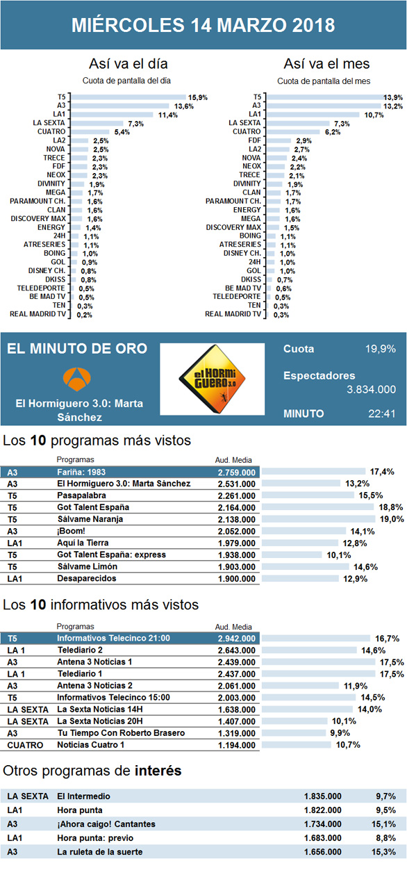 Ya son cinco miércoles consecutivos en los que Antena 3 se aferra al liderazgo. Mientras que El Hormiguero 3.0 repitió como minuto de oro, la miniserie Fariña se mantuvo como lo más visto del día. Sin embargo, el tercer episodio de la ficción perdió en esta ocasión casi medio millón de espectadores en comparación con la semana pasada.