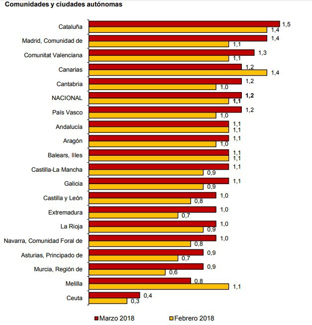 Los precios siguen al alza. La tasa anual del IPC general del mes de marzo es del 1,2%, un décima superior a la registrada el mes anterior. Alimentos y bebidas no alcohólicas es una de los apartados que más pesan en la subida, con un incremento de cinco décimas en la tasa.