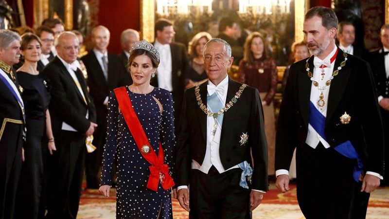 Anoche, los Reyes ofrecieron una cena de gala a Rebelo de Sousa y a un centenar de invitados en el Palacio Real, donde Felipe VI apostó por "estrechar y reforzar aún más" las ya "extraordinarias" relaciones bilaterales, al tiempo que se felicitó de que los dos países "se den la mano y caminen juntos" como "buenos socios y amigos" que comparten un "firme europeísmo" y una misma visión de futuro.