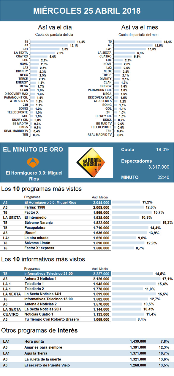 Este miércoles televisivo estuvo marcado por el encuentro de Champions entre el Bayern de Munich y el Real Madrid, retrasmitido por el canal de pago BeIN Sports. El partido atrajo a casi 2,3 millones de telespectadores mientras que, en las cadenas en abierto, El Hormiguero 3.0 consiguió mantener su liderazgo habitual pese a una caída próxima al millón de seguidores respecto con la semana pasada.