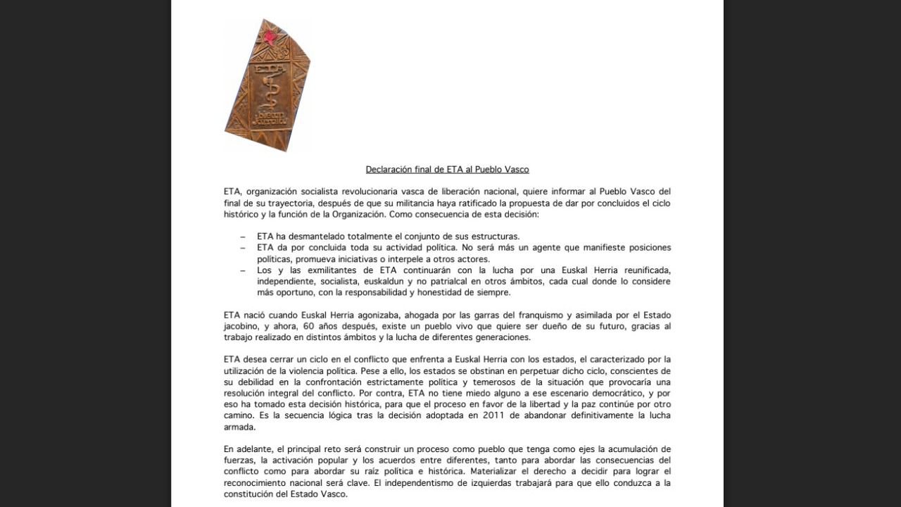 Este jueves, Josu 'Ternera' y 'Anboto' enviaron dos audios a medios interancionales y vascos en los que procedían a la lectura del comunicado de disolución de la banda, que implica el "final de su trayectoria" y el "desmantelamiento" total "del conjunto de sus estructuras".