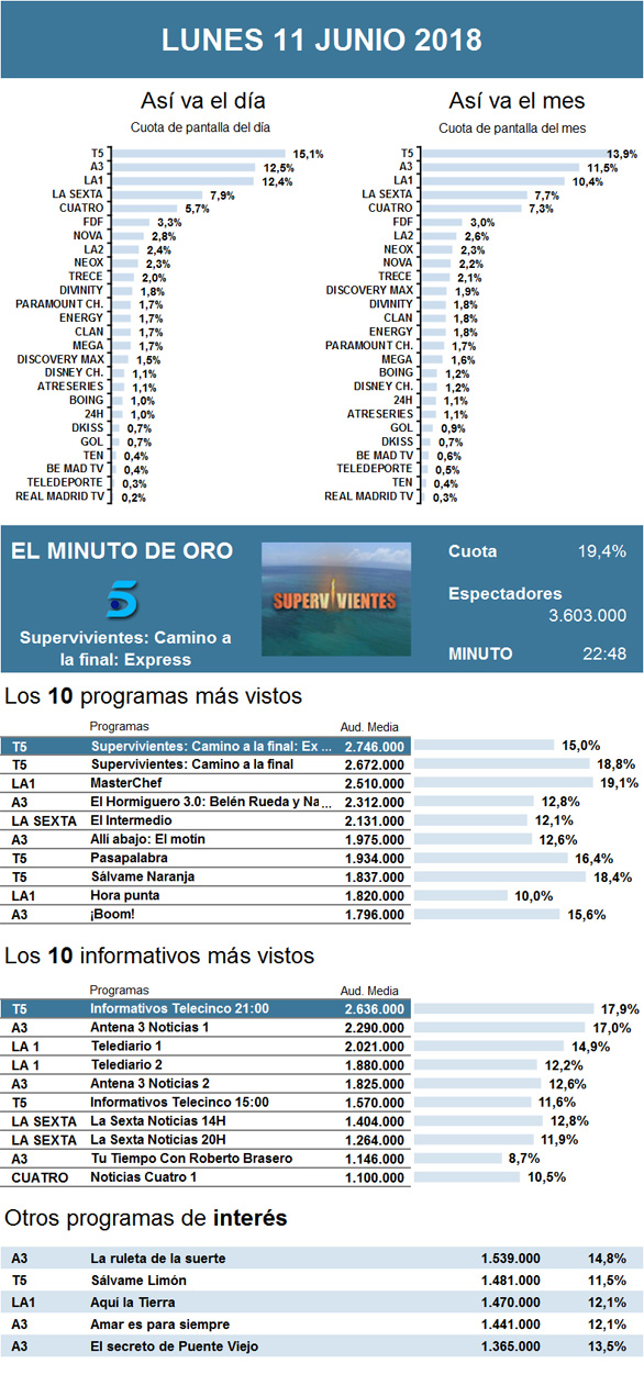 Aunque este lunes Telecinco cogió fuerza con su especial Supervivientes: Camino a la final y reunió a cerca de 2,7 millones de interesados durante el horario estelar, MasterChef fue el programa que más cuota de pantalla alcanzó por la noche. Cabe destacar cómo el 'reality' de Telecinco mejoró los datos de la cadena en más de medio millón de espectadores en relación con los reunidos la semana pasada por La verdad .