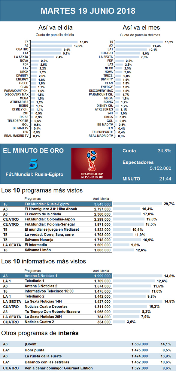Al igual que este lunes, Telecinco no consiguió contagiar el éxito del Mundial a su programa del horario estelar. De este modo, en la principal franja nocturna, se impuso el estreno en Antena 3 de la aclamada serie americana El cuento de la criada. Además, la cadena logró mejorar en un millón el número de seguidores que la cadena obtuvo la semana pasada con su cine.