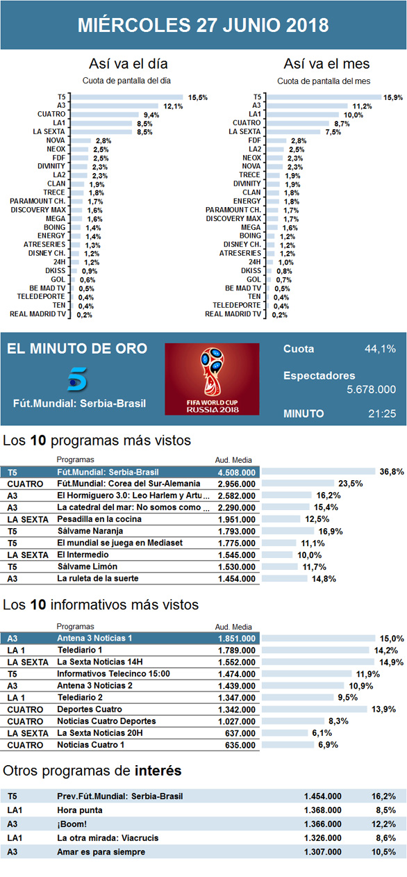 AUDIENCIAS: MIÉRCOLES 27 DE JUNIO DE 2018