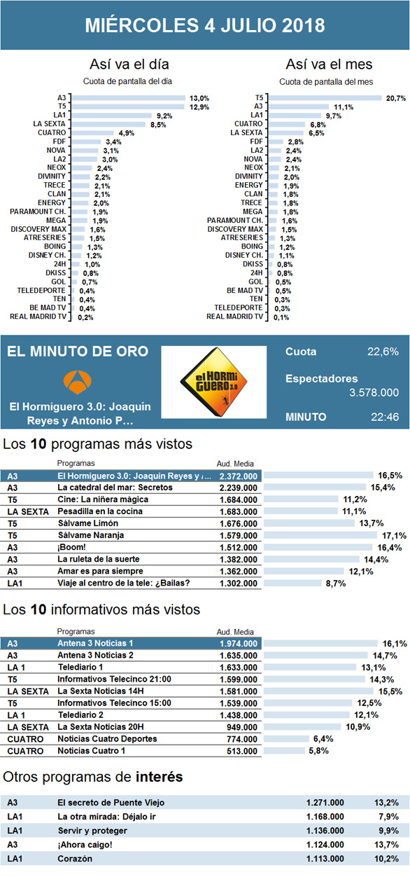 Este miércoles hubo jornada de descanso en el Mundial y se reflejó negativamente en Telecinco, que cedió su puesto como cadena más seguida del día. En su lugar, Antena 3 ocupó dicho puesto gracias, en gran parte, a la audiencia obtenida por El Hormiguero 3.0 y la emisión posterior de un nuevo episodio de La catedral del mar. Mientras que el programa de Pablo Motos se coronó como minuto de oro y fue lo más visto del día, la miniserie se mantuvo como principal opción del horario estelar, sin apenas variar sus registros del miércoles pasado.