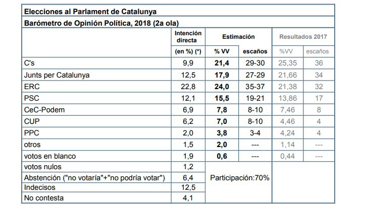 El Centro de Estudios de Opinión de la Generalidad ha publicado este viernes los resultados del segundo barómetro correspondiente a 2018 en el que pregunta sobre intención de voto y cuestiones relacionadas con la identidad catalana. El sondeo ha sido realizado entre el 23 de junio y el 14 de junio entre un universo de 1.500 personas.
