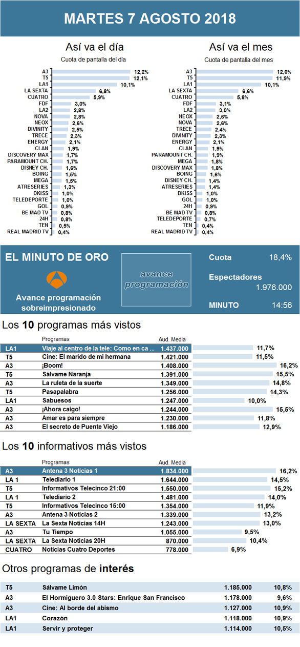 Aunque por tercer martes consecutivo, Viaje al centro de la tele se mantuvo como lo más visto del día, en esta ocasión La 1 no consiguió volver a conquistar la noche. Esta vez fue Telecinco la cadena que sobresalió durante el horario estelar gracias a la película El marido de mi hermana. La cadena acertó apostando por cine, pues atrajo a medio millón de interesados más que la semana pasada con su concurso Mi madre cocina mejor que la tuya. La final del mismo fue pospuesta para su emisión en el 'late night', donde apenas reunió 496.000 seguidores, la mitad que hace una semana.