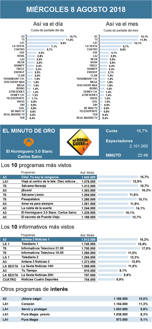 En esta ocasión, Antena 3 logró destacar como cadena más seguida del día. Además, volvió a conseguir imponerse en el horario estelar gracias a una nueva película de acción, Yo soy la venganza, que mejoró levemente los registros de la cinta de la semana pasada, ampliando aún más la distancia con sus rivales.