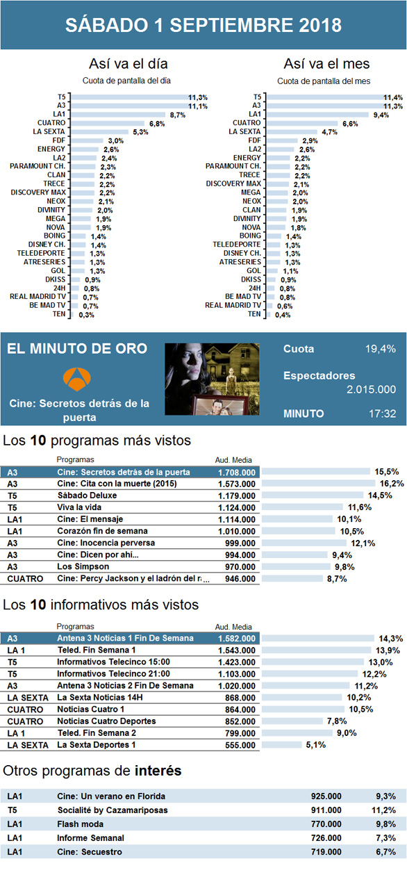 AUDIENCIAS: SÁBADO 1 DE SEPTIEMBRE DE 2018