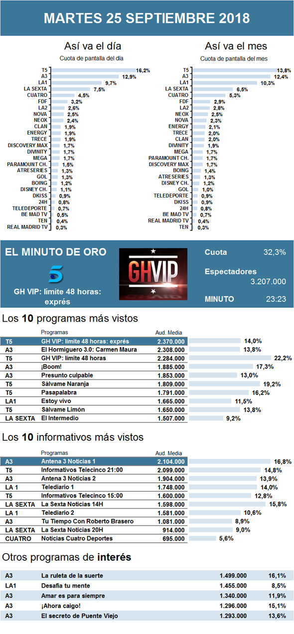 GH VIP. límite 48 horas fue lo más visto de este martes y se adjudicó el minuto de oro. Dejó sin opciones a las series de Antena 3 y La 1. Estoy vivo regresaba a la parrilla con su segunda temporada, cuyo estreno fue seguido por 1.665.000 espectadores y un 11,5 por ciento de cuota; datos que la situaron por detrás de su competidora, Presunto culpable, que logró un share del 13 por ciento.