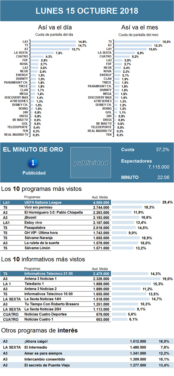 AUDIENCIAS: LUNES 15 DE OCTUBRE DE 2018