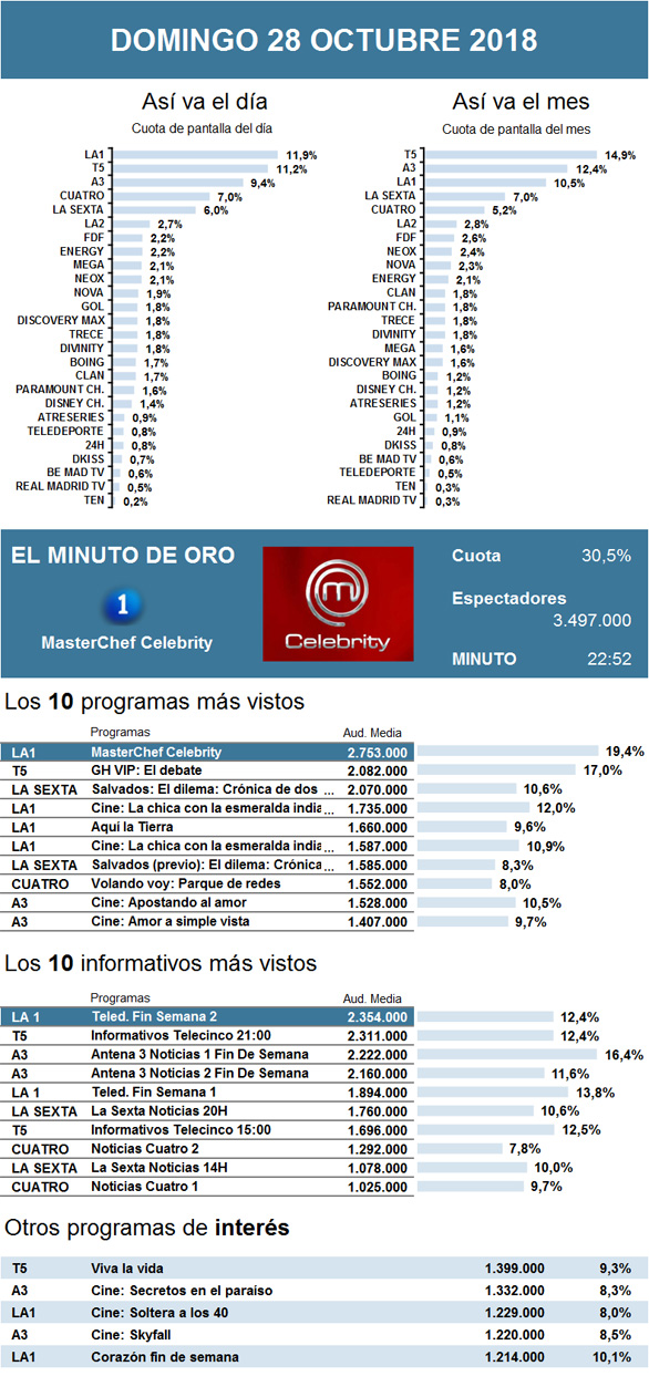 Nuevamente, la noche del domingo estuvo liderada por La 1 y su exitoso MasterChef Celebrity. Sin embargo, el concurso culinario volvió a descender ligeramente su audiencia en relación con la semana anterior. Mayor fue la caída sufrida por GH VIP: El debate que, pese a mantenerse como segunda opción, vio cómo Salvados casi le igualaba en seguidores.