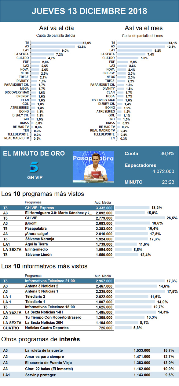 Una semana después de resentirse por el puente de la Constitución, GH VIP volvió a ver descender ligeramente su audiencia en comparación con la semana anterior. Sin embargo, su gala 14 repitió una vez más como líder de la noche. En esta ocasión, el cine de Antena 3 se alzó con el segundo puesto nocturno gracias a la película francesa 22 balas (El inmortal) y a una leve mejora respecto con el seguimiento obtenido por la cinta del jueves pasado.
