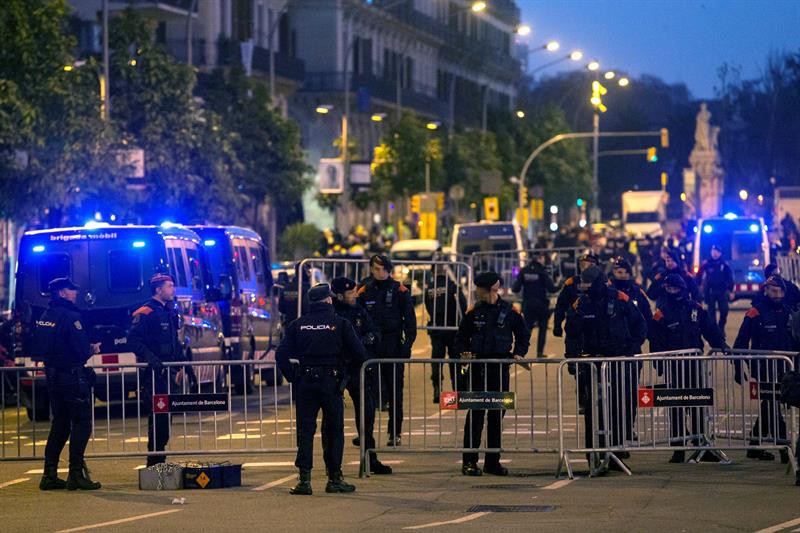 8:45 - Tres columnas de los CDR avanzan hacia el edificio de la Llotja de Mar. Agentes de los antidisturbios de la Policía Nacional y de los Mossos d'Esquadra están posicionados en los alrededores.