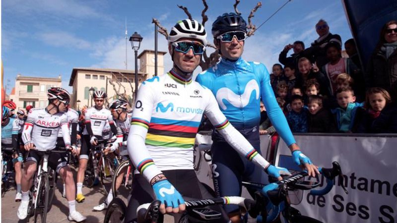 | El campeón del mundo de ciclismo en ruta Alejandro Valverde (Movistar) (i), y su compañero de equipo Mikel Landa (d), hoy en la localidad Mallorquina de Ses Salines, momentos antes de la salida de la primera prueba de la Challenge Vuelta a Mallorca, con un recorrido de 177 kilómetros y con cinco puertos de montaña. (Foto: EFE/ Atienza) |
