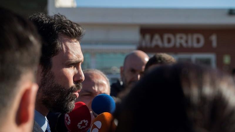 El presidente del Parlament de Catalunya, Roger Torrent, atiende a los medios de comunicación tras salir de la prisión de Alcalá Meco. (Foto: EFE)