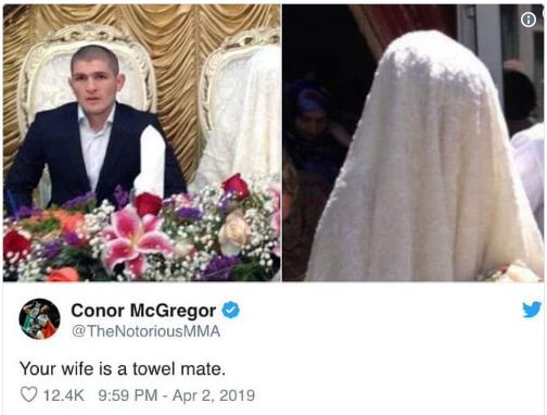 Conor, que tiene 31 años, acudió a su Twitter para lanzar una publicación abrasiva. Pensó que sería razonable emitir un mensaje en el que rescataba una foto de la boda de Khabib para burlarse del aspecto de la mujer del luchador, que profesa la cerrencia musulmana y portaba burka. "Tu esposa parece una toalla, colega", aseguró sobre el tradicional velo islámico. Es la enésima punzada que lanza el irlandés relativa al islam, con lo que ha vuelto a ser tildado de racista en internet. Las acusaciones de islamófobo han colapsado su cuenta.