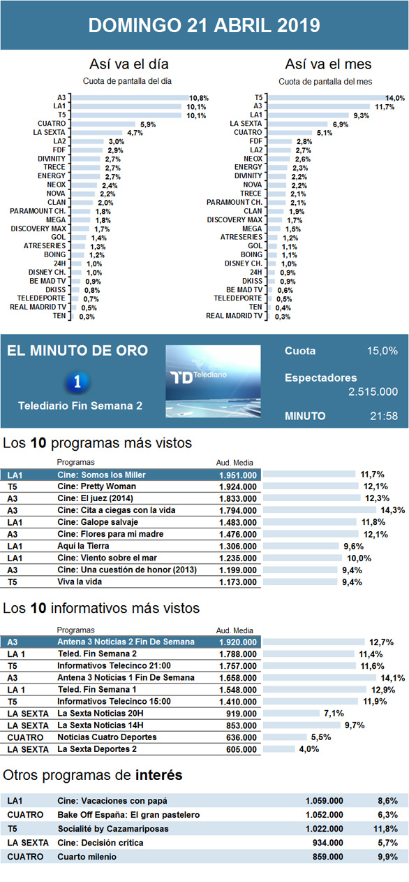 Este domingo, el Telediario nocturno de La 1 se alzó como minuto de oro, pese a que el espacio informativo más seguido del día fue su rival Antena 3 Noticias 2. En lo referido al programa más visto, en esta ocasión se produjo una encarnizada batalla por el primer puesto, protagonizada por las ofertas cinematográficas de la noche: